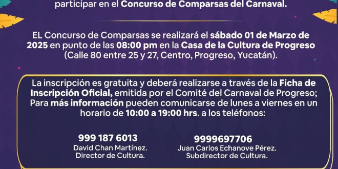 Con el objetivo de sumar talento y alegría a este magno evento, las personas interesadas, así como grupos, academias y organizaciones no gubernamentales, podrán realizar su inscripción el próximo lunes 20 de febrero de 2025. Las inscripciones se llevarán a cabo en las oficinas de la Dirección de Cultura, ubicadas en la planta alta de la calle 80 entre 27 y 25, Centro, Progreso, Yucatán, en horario de lunes a viernes, de 10:00 a.m. a 6:00 p.m.