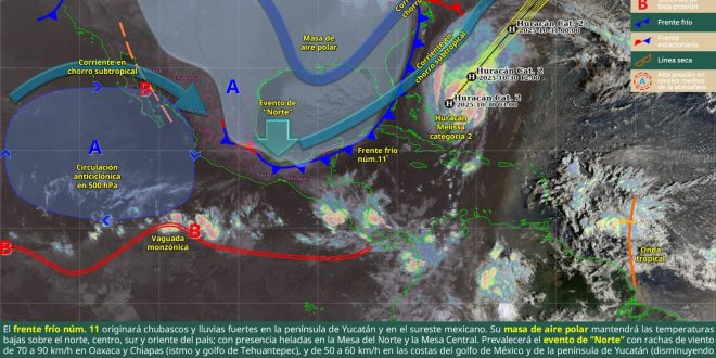 El frente frío número 11 continuará su paso por la Península de Yucatán, generando lluvias de distinta intensidad en la región. Mientras que en Campeche se prevén tormentas puntuales fuertes, en Quintana Roo podrían presentarse intervalos de chubascos, mientras que Yucatán mantendrá lluvias aisladas.