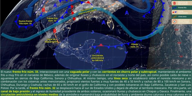 El dominio del sistema anticiclónico en niveles medios de la tropósfera estará generando subsidencia, dejando tiempo estable en Yucatán y Campeche, en la zona sur de Quintana Roo se prevé bajo potencial de lluvias aisladas. Además, el ambiente se tornará muy caluroso en el día y cálido al amanecer, con vientos del este-sureste y rachas de 40 km/h.