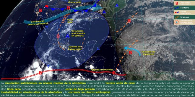 y la costa central y norte de Quintana Roo. El ambiente se tornará muy caluroso a extremadamente caluroso en el día y cálido al amanecer, con viento del este-sureste cambiando por la tarde al noreste, con rachas de 45 km/h en zonas costeras.