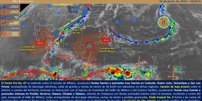 MÉRIDA, Yuc., 10 de junio 2020.-En las próximas 24 horas, se prevé cielo despejado a medio nublado, con baja probabilidad para lloviznas con chubascos aislados, con temperaturas calurosas a muy calurosas durante el día y cálidas al amanecer.