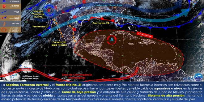 El bloqueo del amplio sistema anticiclónico mantiene tiempo estable, con cielo mayormente despejado y muy baja probabilidad de lloviznas en el sur de Quintana Roo, no se esperan lluvias en el resto de la península de Yucatán. Se prevé viento del este-sureste de 15 a 20 km/h con rachas de 40 km/h en las costas de los tres estados, así como ambiente caluroso durante el día y templadas al amanecer.