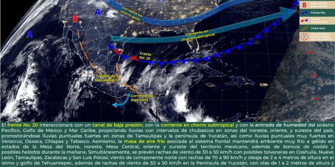 probabilidad de intervalos de chubascos con tormenta en Yucatán, Campeche y Quintana Roo debido a la interacción de una vaguada, extendida desde Centroamérica hasta el sureste de México, con el frente frío número 20, ubicado cerca del arrecife Alacranes. Ambiente cálido durante el día y templado a cálido en la noche, con vientos del este-noreste de 15 a 25 km/h y rachas mayores a 40 km/h.