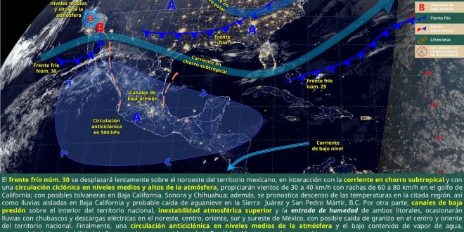 El dominio del extenso anticiclón en niveles medios de la tropósfera, estará dejando tiempo estable sin lluvias en la península de Yucatán. Además, el ambiente se tornará caluroso a muy caluroso en el día y templado a cálido al amanecer. Los vientos de componente este-sureste de 15 a 20 km/h con rachas mayores a 35 km/h en zonas costeras.