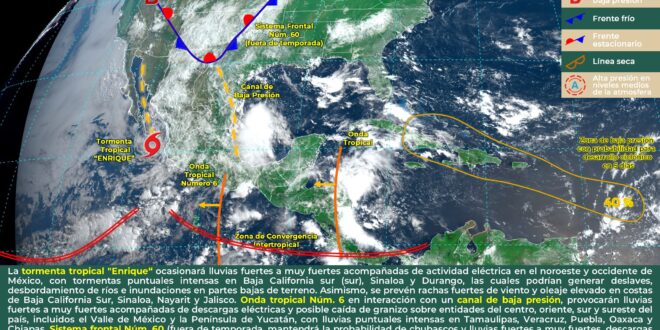 Se prevén condiciones de cielo medio nublado a nublado con probabilidad para chubascos con tormentas fuertes a localmente muy fuertes especialmente en el centro y sur de Quintana Roo y el norte, centro y suroeste de Campeche, así como chubascos con tormentas localmente fuertes en el oriente, centro-sur y noroeste de Yucatán, esto debido al ingreso de aire marítimo tropical combinado con un canal de bajas presiones sobre el sureste del país e inestabilidad en altura. Las temperaturas serán calurosas en el día y cálidas por la noche. Viento de dirección este-sureste cambiando al noreste de 15 a 25 km/h y rachas mayores a 45 km/h en costas de Quintana Roo y Yucatán. Hacia el final del día o las primeras horas de mañana miércoles, se espera la llegada de una nueva onda tropical a las costas de