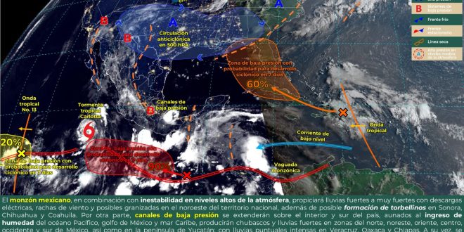 Se prevé cielo parcialmente nublado a nublado, con probabilidad de tormentas puntuales fuertes y chubascos con tormenta en algunas zonas de la península de Yucatán debido al ingreso de aire húmedo proveniente del mar Caribe y golfo de México, aunado al calentamiento diurno de la superficie. Ambiente caluroso a muy caluroso durante el día y cálido en la noche. Vientos del este y este-sureste de 15 a 25 km/h, con rachas mayores a 40 km/h en zonas costeras.