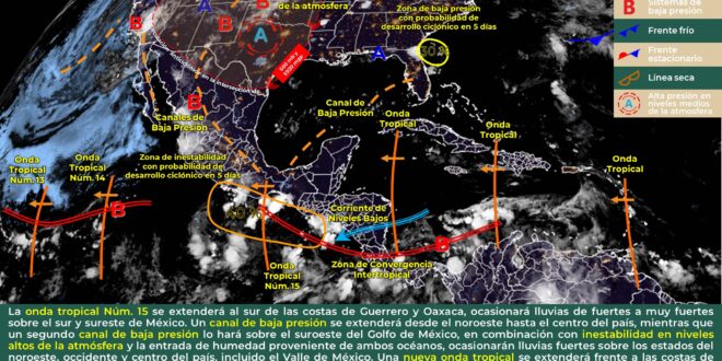 El establecimiento de una vaguada sobre la península de Yucatán en interacción con la cercanía de la onda tropical (No. 16) sobre el golfo de Honduras, ocasionarán potencial para chubascos con tormentas puntuales fuertes en el norte y sur de Quintana Roo, así como tormentas fuertes a muy fuertes en el oriente, centro y suroeste de Yucatán, norte, centro y sur de Campeche. Temperaturas calurosas a muy calurosas durante el día y cálidas en la noche. Viento de dirección este-sureste cambiando al noreste de 15 a 25 km/h y rachas mayores a 40 km/h en zonas costeras y de tormenta.