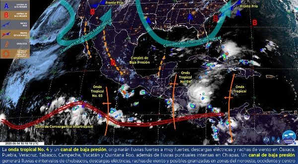El paso de la onda tropical No. 4 sobre la península de Yucatán, generará potencial de chubascos con tormentas puntuales fuertes en el sur y centro de Yucatán, centro y sur de Campeche, así como en el sur de Quintana Roo. Las temperaturas serán calurosas a muy calurosas durante el día y cálidas por la noche, viento de dirección este-noreste cambiando al norte-noroeste de 15 a 20 km/h y rachas mayores a 40 km/h en zonas costeras.