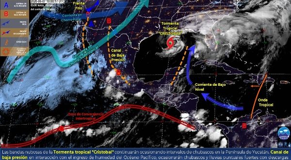 Se prevé que la tormenta tropical “Cristobal” toque tierra en el sur de Estados Unidos, el aporte de humedad que dejó a su paso mantendrá pronostico de chubascos en el norte, noreste, noroeste y sur de Yucatán, centro y sur de Campeche, así como chubascos con puntuales fuertes el sur y norte de Quintana Roo. Las temperaturas serán calurosas a lo largo del día y cálidas en la madrugada, con vientos dominantes del sur-sureste de 15 a 20 km/h con rachas mayores a 45 km/h.