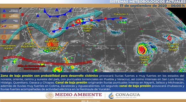 MÉRIDA, Yuc., 17 de septiembre 2020.- En las próximas 24 horas, se prevé cielo medio nublado a nublado, con probabilidad para tormentas, con temperaturas calurosas a muy calurosas durante el día y cálidas al amanecer.