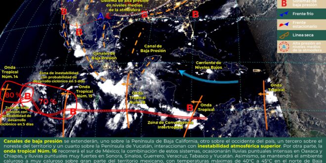 Debido al establecimiento de un canal de bajas presiones, aunado al aporte de humedad de la onda tropical No. 16, misma que continuará recorriendo el sur del país, además de inestabilidad en altura, ocasionarán el incremento de nublados vespertinos con probabilidad para tormentas fuertes a muy fuertes principalmente en sectores del centro, sur y noroeste de Yucatán, norte y suroeste de Campeche, así como lloviznas con intervalos de chubascos en el centro y sur de Quintana Roo. Las temperaturas serán calurosas a muy calurosas durante el día y cálidas en la noche, con viento de dirección este-sureste cambiando al noreste de 15 a 25 km/h y rachas mayores a 40 km/h en zonas costeras.