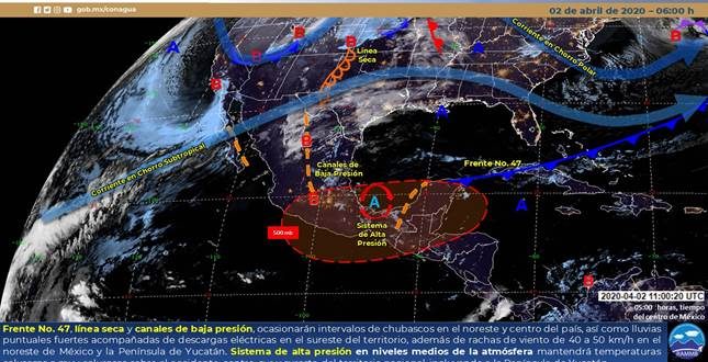 MÉRIDA, Yuc., 02 de abril 2020.- En las próximas 24 horas, se prevé cielo nublado, con probabilidad para lloviznas con intervalos de chubascos, con temperaturas de muy calurosas a extremadamente calurosas durante el día y cálidas al amanecer.