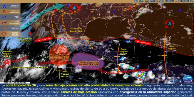 MÉRIDA, Yuc., 13 de agosto 2020.- En las próximas 24 horas, se prevé cielo medio nublado a nublado, con probabilidad para chubascos y tormentas, con temperaturas calurosas a muy calurosas durante el día y cálidas al amanecer.