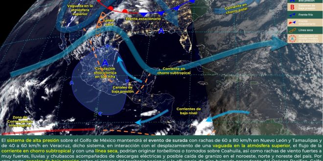 Vientos del este-sureste de 15 a 25 km/h, con rachas mayores a 40 km/h, tornándose del noreste y norte durante la tarde en la costa de Yucatán y Campeche, respectivamente.
