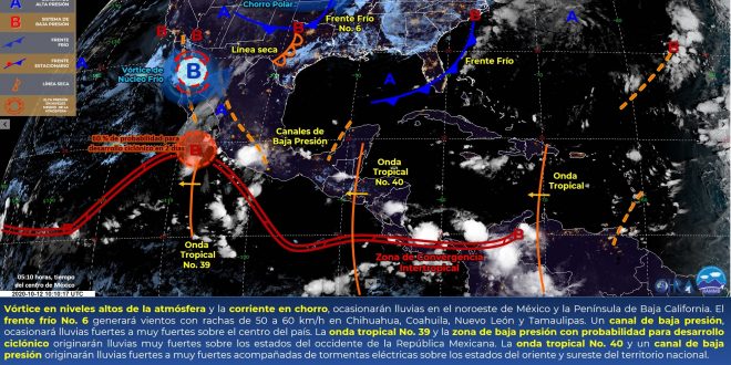 El dominio de un sistema de alta presión sobre la región, favorecerá el ingreso de aire marítimo tropical proveniente del mar Caribe hacia la región, generando condiciones de cielo despejado en la mayor parte de la península de Yucatán; sin embargo, en el transcurso de la tarde, en combinación con una vaguada, se prevén nublados aislados con probabilidad para lluvias e intervalos de chubascos en el oriente y suroeste de Yucatán, norte y sur de Quintana Roo, norte, oriente y sur de Campeche; así como temperaturas calurosas a muy calurosas durante el día y cálidas en la noche. Viento de dirección este-sureste cambiando eventualmente al noreste de 15 a 25 km/h y rachas mayores a 40 km/h sobre la Sonda de Campeche.