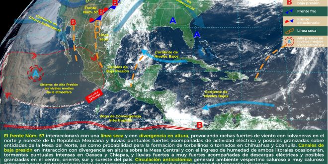 El contenido de humedad sobre la región en combinación con una vaguada sobre la península de Yucatán, mantendrán la probabilidad para intervalos de chubascos en los estados de Yucatán y Quintana Roo, así como intervalos de chubascos con tormentas puntuales fuertes en Campeche. Asimismo, se pronostican temperaturas calurosas a muy calurosas en el día y cálidas en la noche. Viento dominante de dirección este de 15 a 25 km/h y rachas mayores a 40 km/h en zonas costeras.