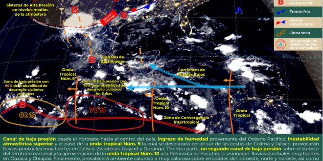 El ingreso de aire marítimo tropical aunado al establecimiento de una vaguada sobre la península de Yucatán, así como el paso de la onda tropical No. 10 al sur de la región, generarán cielo parcialmente nublado con probabilidad para lluvias e intervalos de chubascos en el sur, norte y noroeste de Yucatán, norte, centro y sur de Campeche, norte y sur de Quintana Roo. Las temperaturas serán calurosas a muy calurosas en el día y cálidas en la noche. Viento del este-sureste cambiando al