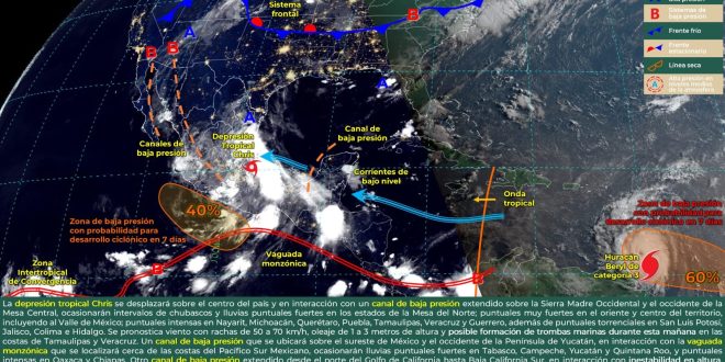 Las bandas nubosas asociadas a la circulación de la Depresión Tropical “CHRIS” sobre el noreste de Puebla, asi como el ingreso de humedad proveniente del mar Caribe hacia la península de Yucatán y el calentamiento diurno en la región, mantendrán la probabilidad de tormentas fuertes a muy fuertes en el oriente, sur y noroeste de Yucatán, centro y sur de Quintana Roo y Campeche. Ambiente cálido a caluroso en el día y cálido en la noche. Viento dominante de dirección este de 15 a 25 km/h y rachas mayores a 40 km/h en zonas de costa y de tormenta.