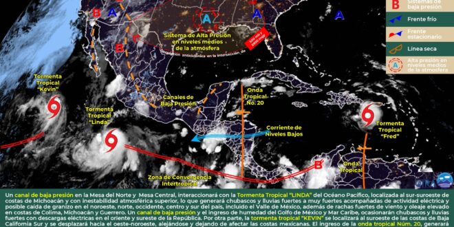 Se prevé que el aporte de humedad asociado a la onda tropical No.20, la cual estará cruzando la península de Yucatán, aunado a la inestabilidad provocada por un vórtice en altura, darán paso al incremento de nublados, con probabilidad para chubascos con tormentas dispersas a lo largo de Quintana Roo, mientras que en sectores del oriente, centro-sur y noroeste de Yucatán, así como el norte, centro y suroeste de Campeche, se prevén chubascos con tormentas fuertes. Asimismo, se espera que las temperaturas sean calurosas a muy calurosas en el día y cálidas por la noche, con viento de dirección este-noreste de 15 a 25 km/h y rachas mayores a 45 km/h en zonas costeras.