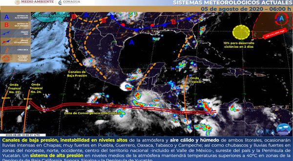 MÉRIDA, Yuc., 05 de agosto 2020.- En las próximas 24 horas, se prevé cielo medio nublado a nublado, con probabilidad de intervalo de chubascos y tormentas, con temperaturas calurosas a muy calurosas durante el día y cálidas al amanecer.