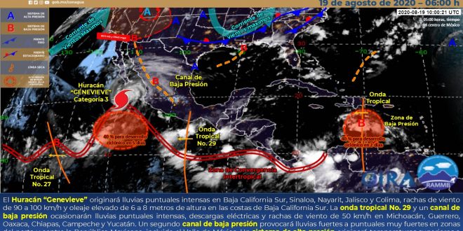MÉRIDA, Yuc., 19 de agosto 2020.- En las próximas 24 horas, se prevé cielo medio nublado a nublado, con probabilidad para tormentas, con temperaturas calurosas a muy calurosas durante el día y cálidas al amanecer.