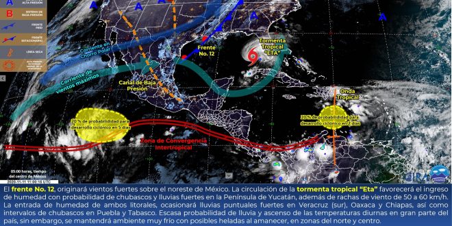 Se prevé la tormenta tropical ”Eta” continúe su desplazamiento hacia el norte, alejándose gradualmente de la península de Yucatán, sin embargo, una vaguada inducida por este sistema aunado al ingreso de humedad impulsado por su amplia circulación, mantendrán condiciones de cielo medio nublado a nublado, con probabilidad para intervalos de chubascos principalmente en el noroeste, centro-sur y oriente de Yucatán, chubascos con tormentas aisladas en el norte y centro de Quintana Roo, así como lloviznas con chubascos en el norte de Campeche. Las temperaturas serán cálidas a calurosas durante el día y templadas a cálidas al amanecer, con viento de dirección oeste-noroeste de 15 a 25 km/h y rachas mayores a 40 km/h en la costa de los tres estados.