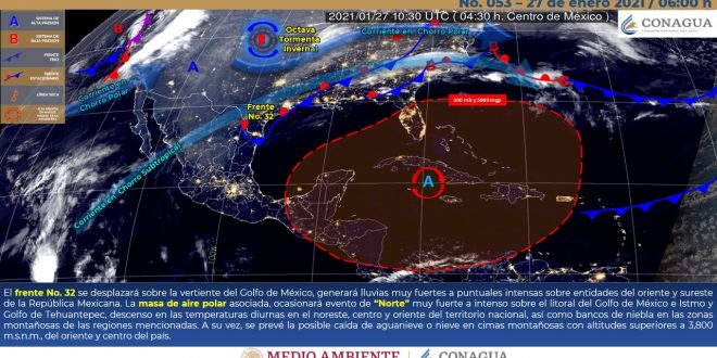 Se prevé que el frente frío No.32 se desplace hasta el centro del golfo de México internándose hasta el sur de Veracruz, sin embargo, la formación de una vaguada pre- frontal sobre la península de Yucatán, propiciará el incremento de nublados vespertinos a nocturnos, con probabilidad para intervalo de chubascos principalmente en sectores del centro y noroeste de Yucatán, norte y suroeste de Campeche y la porción sur de Quintana Roo. El ambiente se mantendrá caluroso durante el día y templado a cálido al amanecer, con vientos del este-sureste, cambiando por la tarde al norte-noreste de 15 a 25 km/h con rachas mayores a 40 km/h en zonas costeras.