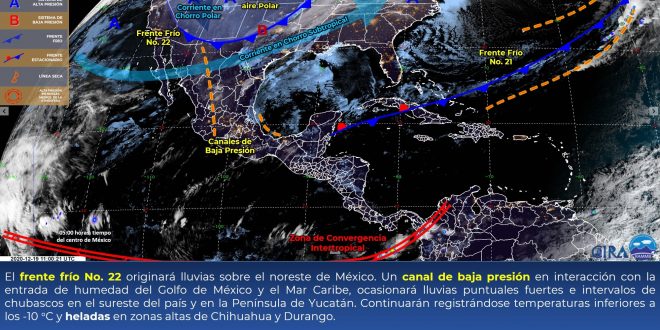 El sistema frontal No. 21 se ubicará con características de estacionario en el sur de la península de Yucatán y alejándose de la región, mantenido chubascos dispersos en el centro y sur de Campeche, sur de Yucatán, así como en el centro y sur de Quintana Roo. Asimismo, se esperan temperaturas cálidas durante el día y templadas a cálidas al amanecer, viento de dirección este-noreste de 15 a 25 km/h y rachas de 40 km/h en zonas de costa.