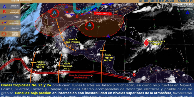 En paso de la onda tropical no. 24 sobre la peniìnsula de Yucataìn propiciaraì el incremento de nublados desde el mediodiìa previeìndose intervalo de chubascos con tormentas en el norte de Quintana Roo, asiì como puntuales fuertes en el norte-centro y noreste de Yucataìn y sur de Campeche. Tambieìn se esperan temperaturas maìximas de calurosas a muy calurosas y caìlidas en la noche, con viento del este-noreste cambiando eventualmente al noreste de 15 a 25 km/h y rachas de 50 km/h sobre las costas.