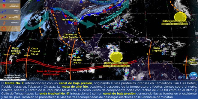 MÉRIDA, Yuc., 16 de octubre 2020.- Se prevé que durante esta tarde, el ingreso de humedad y un canal de baja presión al sur de la península de Yucatán favorezcan el desarrollo de nublados con probabilidad de intervalo de chubascos con tormentas fuertes en el norte y centro de Quintana Roo, en el centro y sur de Campeche, así como en el noreste y oriente de Yucatán, mientras que en el resto de la región las lluvias serán de menor intensidad. Las temperaturas serán calurosas durante el día y cálidas al amanecer, con vientos del norte-noreste de 15 a 25 km/h y rachas superiores a 45 km/h en zonas costeras.