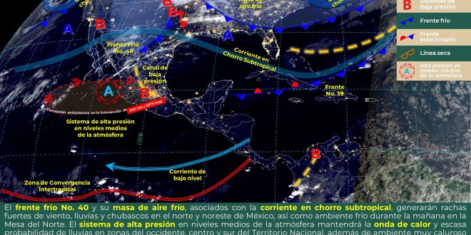 La circulación de un sistema anticiclónico favorecerá el ingreso de aire cálido y húmedo hacia la región, previendo que propicien nublados dispersos con probabilidad de lloviznas y chubascos aislados sobre el sur y centro de Campeche, oriente y sur de Yucatán, así como a lo largo del sur y centro de Quintana Roo. Asimismo, se esperan temperaturas cálidas a calurosas durante el día y templadas a cálidas al amanecer, con viento de dirección norte-noreste de 15 a 25 km/h y rachas mayores a 45 km/h en zonas costeras de Yucatán y Campeche.
