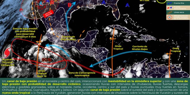 Se prevé que la vaguada que se extenderá desde el golfo de México hacia la península de Yucatán ocasione el incremento de nubosidad durante la tarde y con ello la probabilidad de intervalo de chubascos con tormentas puntuales fuertes en el norte de Quintana Roo, oriente, centro y sur de Yucatán, así como en el centro y sur de Campeche. Las temperaturas se mantendrán en rangos de