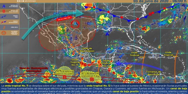 La humedad asociada a la onda tropical No.12 , el fuerte calentamiento diurno y una vaguada en los niveles altos de la atmósfera mantendrán condiciones de cielo parcialmente nublado a medio nublado con probabilidad de intervalo de chubascos con tormentas en el norte y sur de Quintana Roo, así como tormentas fuertes a puntuales muy fuertes a lo lago de Campeche y en el noreste, norte-centro y noroeste de Yucatán. Asimismo, las temperaturas serán calurosas a muy calurosas durante el día y cálidas al amanecer, con viento del este-sureste cambiando por la tarde al noreste de 15 a 25 km/h y rachas mayores a 45 km/h sobre la costa de Yucatán y la sonda de Campeche.
