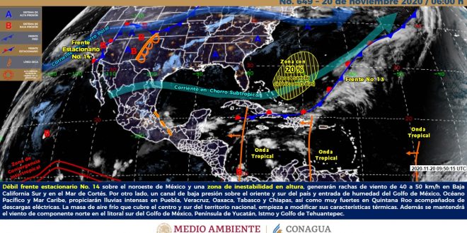 MÉRIDA, Yuc., 20 de noviembre 2020.- En las próximas 24 horas, se prevé cielo mayormente despejado a parcialmente nublado, con probabilidad de chubasco aislados. Temperaturas cálidas a calurosas durante el día y templadas a cálidas al amanecer.