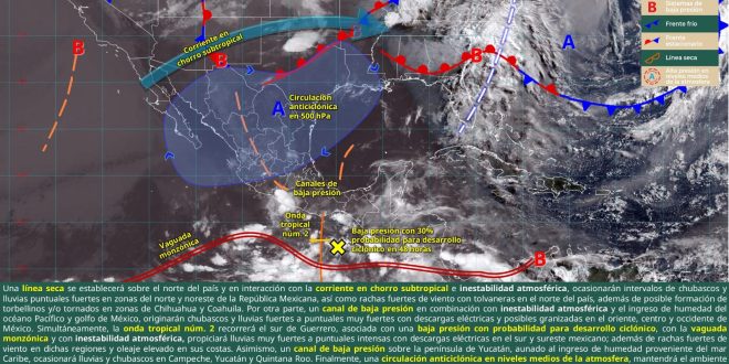 Estos fenómenos se deben a la formación de una vaguada, inducida por el calentamiento diurno de la superficie terrestre, en combinación con el ingreso de aire húmedo proveniente del mar Caribe y el golfo de México. Esta interacción atmosférica también afectará a Campeche, con posibles tormentas, y a Quintana Roo, donde se prevén lluvias dispersas.