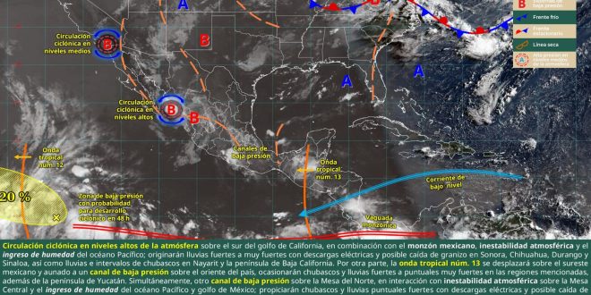 La presencia de una vaguada en el sur de la península y la influencia de la onda tropical número 13 generarán condiciones propicias para lluvias en el centro, noroeste y sur de Yucatán. También se esperan precipitaciones en el centro y sur de Quintana Roo, así como en gran parte de Campeche.
