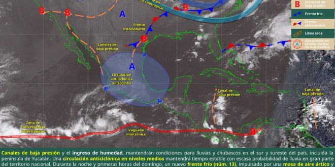 Un canal de bajas presiones sobre la península, en interacción con divergencia en niveles altos de la atmósfera, propiciará lluvias moderadas en buena parte del territorio yucateco, así como en el norte de Campeche y el centro y norte de Quintana Roo.