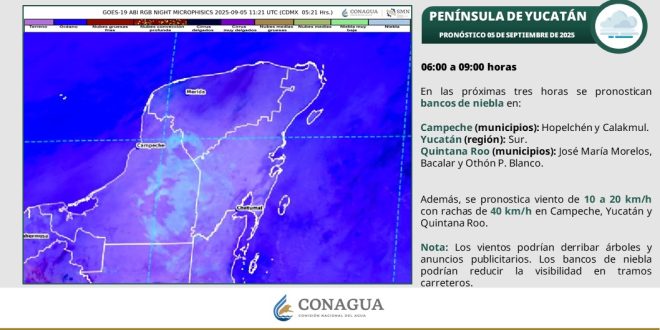 MÉRIDA, Yuc., 5 de septiembre de 2025.- En las próximas 24 horas, se esperan condiciones de cielo despejado a parcialmente nublado en Yucatán, con probabilidad de chubascos acompañados de tormentas dispersas en el noroeste, centro y noreste del estado, además de lluvias ligeras en el resto de la entidad.