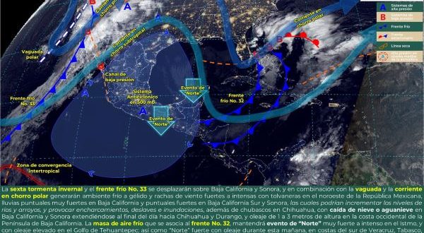 Se prevé cielo despejado a parcialmente nublado, con probabilidad de lloviznas aisladas en algunas zonas de la región debido al ingreso de aire húmedo del golfo de México, asociado a la masa de aire frío que impulsó al sistema frontal núm. 32. Asimismo, la masa de aire frío mencionada mantendrá el evento de “Norte” moderado a fuerte de 30 a 40 km/h, con rachas mayores a 50 km/h en zonas costeras, oleaje de 2 a 3 metros de altura, así como ambiente cálido durante el día y fresco a templado en la noche.
