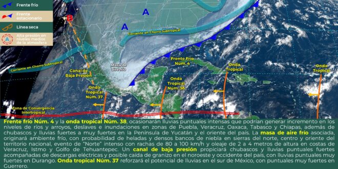 La cercanía del frente frío No.4 al occidente de la península de Yucatán, estará induciendo una vaguada sobre la región, dejando tormentas fuertes en el noroeste, centro y noreste de Yucatán, norte y sur de Quintana Roo, así como muy fuertes en el centro y suroeste de Campeche. Las temperaturas serán calurosas a muy calurosas en el día y cálidas durante la noche. Viento del este-noreste de 15 a 20 km/h y rachas de 40 km/h en zonas costeras.
