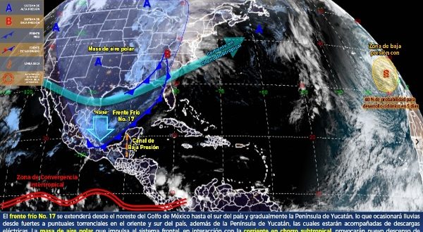 Se espera que el frente frio No. 17 ingrese a la península de Yucatán, generando aumento de nublados con probabilidad para chubascos y lluvias fuertes en Yucatán, Quintana Roo y Campeche. Asimismo, se prevé cambio en la dirección del viento de componente norte-noroeste de 20 a 30 km/h y rachas mayores a 60 km/h en zonas costeras. Temperaturas cálidas a calurosas durante el día y templadas a cálidas al amanecer.