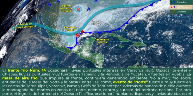 Debido a la cercanía del frente frío No. 14 hacia la península de Yucatán, se prevén condiciones de cielo medio nublado a nublado en gran parte de la región, con probabilidad para intervalos de chubascos y lluvias fuertes en el norte y oriente de Yucatán, norte y centro de Quintana Roo, norte y sur de Campeche. Temperaturas cálidas en el día y templadas a cálidas durante la noche. Viento del noroeste de 15 a 30 km/h y rachas mayores a 40 km/h en zonas costeras de Yucatán y Campeche.
