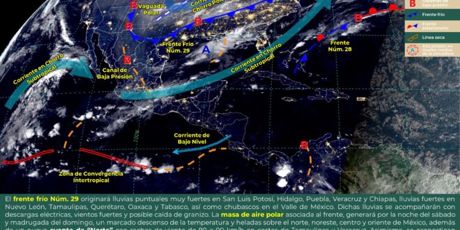 Una vaguada se extenderá sobre el norte de la península hasta el occidente, inducida por el frente frío No. 29, el cual se localizará desplazándose sobre el golfo de México, esto favorecerá nublados y tormentas fuertes nocturnas en el centro, norte y noroeste de Yucatán, centro