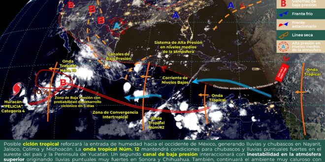 Una vaguada profunda y el desplazamiento de la onda tropical No. 12, favorecerán tormentas fuertes a muy fuertes en zonas del norte, centro y noroeste de Yucatán, norte y sur de Campeche, así como puntuales fuertes en el norte y centro de Quintana Roo. Las temperaturas serán calurosas a muy