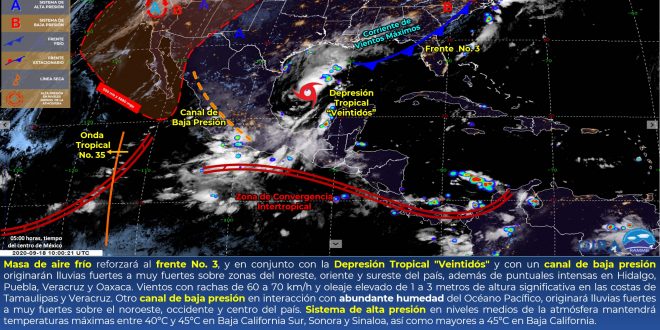 La depresión tropical “Veintidós” se desplazará sobre el centro y norte del golfo de México extendiendo una vaguada hacia el sureste del país y la península de Yucatán, además el flujo de humedad hacia la región originarán condiciones de cielo medio nublado a nublado con probabilidad de intervalo de chubascos con tormentas puntuales fuertes en el centro y norte de Quintana Roo, mientras que en el sur, noroeste y norte-centro de Yucatán, sur y norte de Campeche las tormentas serían puntualmente muy fuertes. El ambiente será cálido al amanecer y por la tarde los valores de temperatura serán de calurosos a muy calurosos con viento del sur-sureste cambiando al oeste-noroeste de 15 a 25 km/h y rachas mayores a 45 km/h en las costas de Campeche.