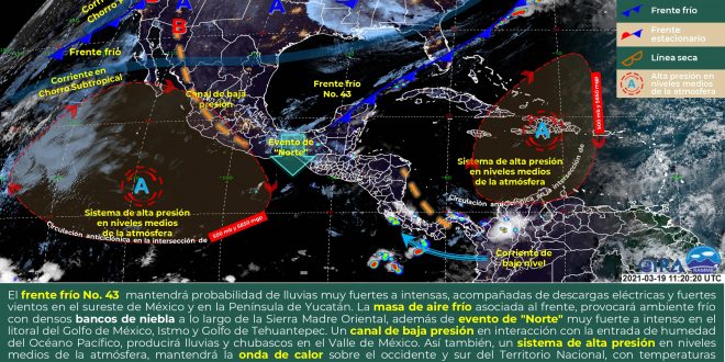 Se prevé que el frente frío No.43 recorrerá la península de Yucatán manteniendo condiciones de cielo medio nublado a nublado y probabilidad de intervalo de chubascos en el centro y sur de Campeche, así como en el sur y oriente de Yucatán, mientras que en el centro y sur de Quintana Roo se esperan lluvias con tormentas fuertes a puntuales muy fuertes. Las temperaturas serán de cálidas a calurosas a lo largo del día y de frescas a templadas durante el amanecer de sábado, asimismo se prevé viento de componente norte de 15 a 25 km/h con rachas de 50 km/h en la sonda de Campeche y costas de Yucatán.