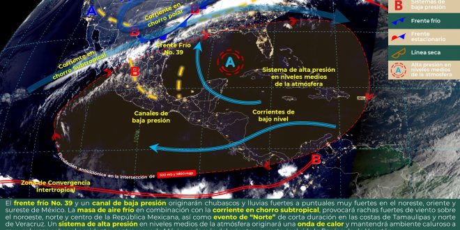El ingreso de aire cálido y húmedo proveniente del mar Caribe hacia la región, continuará favoreciendo tiempo estable con cielo despejado y nubosidad dispersa en el oriente y sur de Yucatán, así como cielo despejado y nubosidad dispersa con probabilidad para lloviznas aisladas sobre el norte, sur y costa de Quintana Roo, oriente, centro y sur de Campeche. Las temperaturas se mantendrán en rangos de calurosas a muy calurosas durante el día y cálidas en la noche. Viento de dirección sureste de 15 a 30 km/h y rachas mayores a 45 km/h sobre el litoral costero. Por otra parte, el frente frío No. 39 ingresará al noroeste del golfo de México.