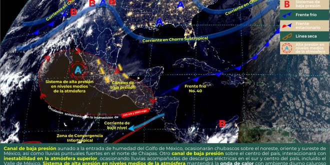 Se espera que la masa de aire frío que dio impulso al sistema frontal No. 40 hacia el mar Caribe, cubra gran parte de la península de Yucatán, generando cielo medio nublado con probabilidad para lloviznas e intervalos de lluvia sobre la porción noreste y oriente de Yucatán, norte, sur y costa de Quintana Roo, sur y oriente de Campeche. Asimismo, se prevén temperaturas cálidas a calurosas en el día y templadas durante la madrugada. Viento de dirección noreste de 15 a 25 km/h y rachas mayores a 45 km/h en zonas costeras.