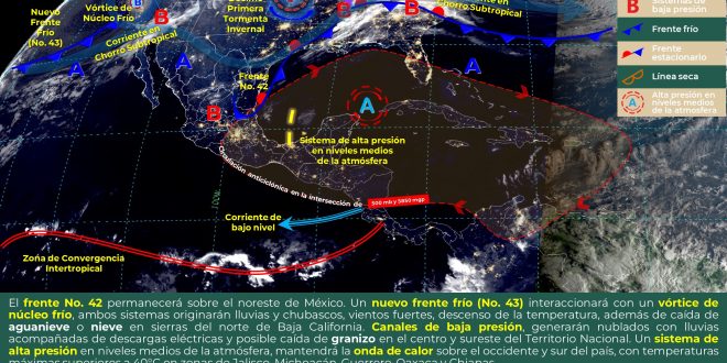 Se espera que el ingreso de aire marítimo tropical proveniente del mar Caribe hacia la península de Yucatán, continúe favoreciendo condiciones de cielo despejado en la mayor parte de la región, así como nubosidad dispersa con lloviznas ocasionales en el sur, centro y costa de Quintana Roo. Temperaturas calurosas a muy calurosas durante el día y templadas a cálidas al amanecer. Viento de dirección sureste de 15 a 25 km/h y rachas mayores a 40 km/h en zonas costeras.