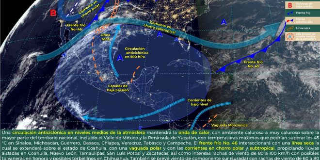 Se prevé cielo despejado a parcialmente nublado, sin probabilidad de lluvias, debido a la influencia de un anticiclón en niveles medios de la tropósfera. Ambiente caluroso a muy caluroso durante el día y cálido en la noche. Vientos del este y este-sureste de 15 a 25 km/h, con rachas mayores a 40 km/h, tornándose del este-noreste y norte durante la tarde en la costa de Yucatán y Campeche, respectivamente.
